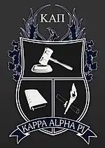 The Kappa Alpha Pi crest features a shield decorated with a gavel, the Book of Knowledge, and a torch that symbolize law and justice.[11] At the base of the shield is a scroll with the fraternity's name.[11] Above the shield is the Wreath of Victory and a phoenix which represents the fraternity's history.[11]