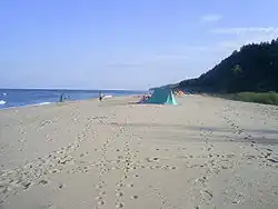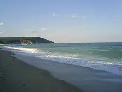 Karadere (Bulgarian: Кара дере) is one of the last remaining unblighted by mass tourism development areas with a wild beach on the Bulgarian Black Sea Coast. The name derives from the Turkish kara meaning black and dere meaning gully. Situated to the northern slopes of the Balkan Mountains, Karadere is about 5 kilometers away from the town of Byala and the village of Goritsa, Varna Province. The beach spans 5 kilometers in length and is bordered by a mixed oak forest, vineyards and cultivated land. The mouths of the Karadere river and the Byala river are situated on the beach. Although Karadere is relatively close to the town and village, it is difficult to reach because there is no infrastructure. Bumpy dirt roads and tracks lead to the beach where there is no cell phone service, electricity, tap water, sewage or any other urban facilities. Despite the lack of main utilities and facilities, Karadere has unique natural offerings—the fine sand, the clean sea water, the fresh air, the sunny weather, the spring water, the mud baths and even the opportunity to spot a dolphin in the bay.[1]
