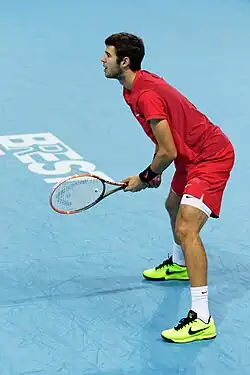 He continued with good performances, reaching the semifinal of the Halle Open. There he achieved his first win on grass over Gilles Simon,[10] and then recorded his second career top 10 win, after defeating Kei Nishikori. He lost to Roger Federer and failed to reach the final. This result ensured him a first Grand Slam seed place at the following Grand Slam at Wimbledon. There, he also had another great result, reaching his first third round, after wins over Andrey Kuznetsov and Thiago Monteiro. He then lost to Rafael Nadal.[11] His successful journey then continued with two consecutive quarterfinals at the Båstad Open and the Hamburg Open. However, he then started to struggle with form. He was eliminated in the first round at both the Canadian Open and the US Open, but reached the third round of the Cincinnati Open. In September he played in the Davis Cup for the second time in a year. He played against Hungarian players, winning against Attila Balázs and losing to Márton Fucsovics. He then went to China, reaching the second round of the Chengdu Open and the China Open and losing in the first round of the Shanghai Masters. He then returned to Europe, but still with no success, with only first rounds of the Vienna Open and the Paris Masters. He finished the year with his debut at the Next Gen ATP Finals. He overcame Jared Donaldson, but lost to Daniil Medvedev and Borna Ćorić, so failed to pass the round robin group.