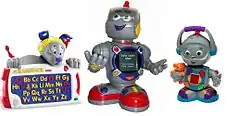 In 2002 Fisher-Price introduced the Kasey the Kinderbot (pictured center, voiced by Kamala Kruszka) Educational line of toys that was capable of teaching 40 learning skills to pre-schoolers including basic math, reading, and science.[4] Kasey has moving eyes, head, waist, arms and hands all of which are coordinated to its voice and LCD display screen. According to Fisher-Price Kasey incorporated the use of a special learning circuit for reinforcement and education.[5]