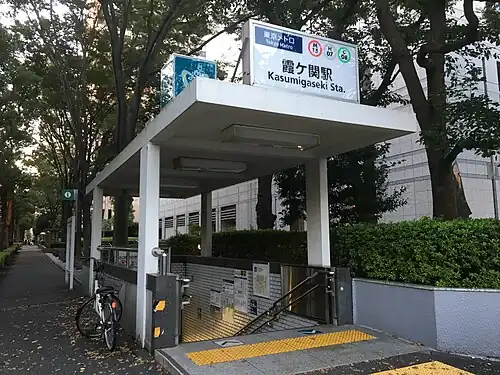 Kasumigaseki Station (霞ヶ関駅, Kasumigaseki-eki) is a subway station in Chiyoda, Tokyo, Japan, operated by the Tokyo subway operator Tokyo Metro. The station is located in the Kasumigaseki government district.