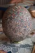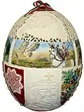 Another special egg created by zsigóné is the Talking Egg (Hungarian: A Beszélő Tojás).[39][40][41][42] This egg uses traditional waxed technique, and depicts 348 classic, traditional Hungarian motifs, which are separated by 13000 dots, symbolizing seeds.[43][44][45]