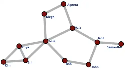 For example, in the figure on the right, assume that John's centrality is being measured and that . The weight assigned to each link that connects John with his immediate neighbors Jane and Bob will be . Since Jose connects to John indirectly through Bob, the weight assigned to this connection (composed of two links) will be . Similarly, the weight assigned to the connection between Agneta and John through Aziz and Jane will be and the weight assigned to the connection between Agneta and John through Diego, Jose and Bob will be .