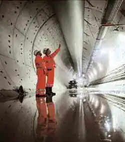 In March 2007, the ventilation shafts were connected to the tunnel lining.[28] The breakthrough of the eastern tunnel was achieved on 20 September 2007 at about 16:35 and the breakthrough of the western tunnel followed on 1 October 2007 at 15:10. A total of around 1.80 million m3 of solid material and 2.45 million m3 of loose material (of which 125,000 m3 consisted of pre-cut material) was extracted.[10][12]