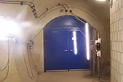 A usable section of 62 m2 (above the top of the rail) was created, with a full section of 95 m2. The inner radius (excluding access space) is 4.70 m[1] To avoid tunnel booms, the cross-section of the tunnels gradually narrows towards the tunnel centre. This is intended to prevent air pressure fluctuations from exceeding two-thirds of the level of conventional rail tunnels.[33] In addition, portal hoods with ventilation slots were built for the first time in Europe.[34] Because of these measures, which were adopted after the letting of the contract, the tunnel had to be put into operation later than originally planned.[35]