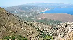 It is situated in the northern foothills of the Thripti Mountains overlooking the Gulf of Mirabello, at an elevation of 427 m above sea level. The ancient name of the site is unknown. "Vronda" ("Thunder Hill"), as it was called by the pioneering archaeologist Harriet Boyd [Hawes] at the beginning of the 20th century,[2] is a local toponym; the entire ridge and surrounding area are also referred to as "Xerambela" ("Dry Vineyards"; Greek: Ξεράμπελα).[3] Most of the visible remains on the site belong to a "Dark Age" settlement[4] dating to the Late Minoan IIIC period (c. 1170–1050 BCE) and a slightly later, Early Iron Age cemetery (c. 1050–600 BCE).[5]