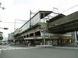 The station consists of two opposed elevated side platforms, with the station building underneath.
