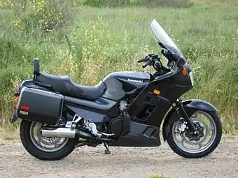 The Kawasaki Concours, known in Europe as the 1000GTR and in USA as the ZG1000, is a 997 cc, six speed, four cylinder, liquid-cooled sport touring motorcycle with shaft drive. The bike can reach speeds over 190 km/h (120 mph), offers nimble handling and – with its full fairing, tall screen, twin locking panniers, and 28 litres (6.2 imp gal; 7.4 US gal) fuel capacity – is suited to cross-country two-up touring.