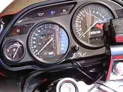 Analogue instrumentation included standard speedometer on the left that rose in single MPH increments up to 170. Unlike the Suzuki competitor, the Katana, signal lights on the Kawasaki's cluster were amber instead of green. Owners could also rely on a fuel gauge on the left (missing on D series) and a temperature gauge on the right which many motorcycles in the same class did not have at the time. Storage was minimal, but better than most sport bikes. There was room beneath the seat for the manual and registration, but not much else. An additional compartment could be found on the left side of the fairing and the ignition key was needed to open it.