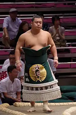 Following a 5–2 record as West Makushita 1, Kawazoe earned a promotion to the jūryō division, along Yūma and Ukrainian Shishi,[11] despite a fracture in the back of his left foot.[12] On the occasion of his promotion it was announced that he would take the shikona, or ring name, Kihō (輝鵬). It was revealed that this ring name, chosen on the night of his fourth victory securing his promotion, was chosen by Kawazoe himself with the kanji for "shine" (輝) as he wishes to become a wrestler who shines ever brighter.[12] His shikona first name, "Tomotaka" (智貴), is a combination of his father's Tomonori (智徳) and mother's Takayo (貴代).[13] During the interview introducing the new jūryō wrestlers, the now Kihō expressed regret at having fallen behind the promotion records of his stablemate Hakuōhō, vowing to overtake him in the rankings.[12] Upon promotion, Kihō became the smallest active sekitori, replacing his stablemate Enhō, and complementing Hokuseihō, another stablemate, who was the tallest sekitori at the time.[13] At 115 kg (254 lb) he was also, along with Midorifuji, the lightest active sekitori.[14]