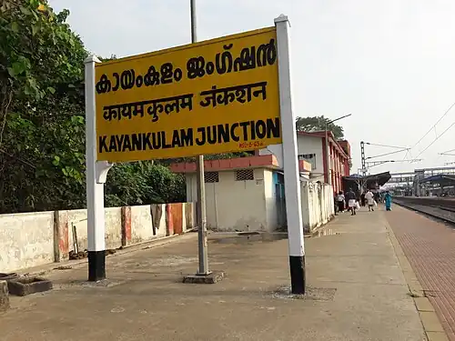 Kayamkulam Junction railway station (station code: KYJ[2]) is an NSG–3 category Indian railway station in Thiruvananthapuram railway division of Southern Railway zone.[2] It is a railway station in Kerala, located at Kayamkulam, Alappuzha district. It is an NSG 3 category station. It stands at the junction of three lines- south towards Thiruvananthapuram via Kollam, north towards Ernakulam via Alappuzha and north-east towards Ernakulam Junction/Ernakulam Town via Kottayam. The station is located 1.7 km (1.1 mi) from Kayamkulam town, near Kayamkulam–Punalur Road (KP road). In 2018, the rail wi-fi broad-band connection has been introduced in Kayamkulam.