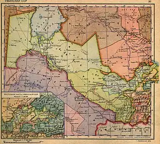 NTD of the area along ethnic lines had been proposed as early as 1920.[12][13] At this time Central Asia consisted of two Autonomous Soviet Socialist Republics (ASSRs) within the Russian SFSR: the Turkestan ASSR, created in April 1918 and covering large parts of what are now southern Kazakhstan, Uzbekistan and Tajikistan, as well as Turkmenistan, and the Kirghiz Autonomous Soviet Socialist Republic (Kirghiz ASSR, Kirgizistan ASSR on the map), which was created on 26 August 1920 in the territory roughly coinciding with the northern part of today's Kazakhstan (at this time Kazakhs were referred to as ‘Kyrgyz’ and what are now the Kyrgyz were deemed a sub-group of the Kazakhs and referred to as ‘Kara-Kyrgyz’ i.e. mountain-dwelling ‘black-Kyrgyz’). There were also the two separate successor ‘republics’ of the Emirate of Bukhara and the Khanate of Khiva, which were transformed into the Bukhara and Khorezm People's Soviet Republics following the takeover by the Red Army in 1920.[14]