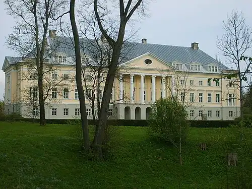 Kazdanga Palace is located in the village Kazdanga (Polish and German Katzdangen[1]), Kazdanga Parish, South Kurzeme Municipality, in the Courland region of Latvia. The first manor house was made out of wood and the new palace was built in 1800–1804 in the late classical style, designed according to the project by the German architect J. G. Berlitz. Kazdanga established the first Latvian fish pond, now in operation for a number of important agricultural schools.