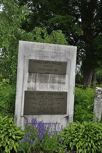 One of the area's early settlers was Cephas Kent, Sr., who moved to the area in 1773 and built a house and tavern. While there is some disagreement about which structure was the Cephas Kent Tavern, one of the two buildings stands at the bottom of the road and the other was moved up the hill from its original location. It was at Kent's tavern that a series of meetings took place in 1775, when the settlers of the area that is now Vermont, disputed between New York and New Hampshire, negotiated a set of agreements among themselves that resulted in the founding in 1777 of the independent Vermont Republic. The site of the Kent Tavern is marked by a marble memorial, placed in 1912. Many of the older houses in the area were built by members of the extended Kent family.[2]