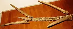 The first fossils of Kentrosaurus were discovered by the German Tendaguru Expedition in 1909, recognised as belonging to a stegosaur by expedition leader Werner Janensch on 24 July 1910, and described by German palaeontologist Edwin Hennig in 1915.[1] The name Kentrosaurus was coined by Hennig and comes from the Greek kentron/κέντρον, meaning "sharp point" or "prickle", and sauros/σαῦρος meaning "lizard",[2] Hennig added the specific name aethiopicus to denote the provenance from Africa.[1] Soon after its description, a controversy arose over the stegosaur's name, which is very similar to the ceratopsian Centrosaurus. Under the rules of biological nomenclature, forbidding homonymy, two animals may not be given the same name. Hennig renamed his stegosaur Kentrurosaurus, "pointed-tail lizard", in 1916,[3] while Hungarian paleontologist Franz Nopcsa renamed the genus Doryphorosaurus, "lance-bearing lizard", the same year.[4][5] If a renaming had been necessary, Hennig's would have had priority.[6] However, because the spelling is different, both Doryphorosaurus and Kentrurosaurus are unneeded replacement names; Kentrosaurus remains the valid name for the genus with Kentrurosaurus and Doryphorosaurus being its junior objective synonyms.[7]
