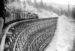 The Kettle Valley Railway (reporting mark KV)[1] was a subsidiary of the Canadian Pacific Railway (CPR) that operated across southern British Columbia, west of Midway running to Rock Creek, then north to Myra Canyon, down to Penticton over to Princeton, Coalmont, Brookmere, Coquihalla and finally Hope where it connected to the main CPR line.