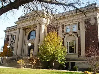 The Kewanee Public Library is a Carnegie library located at 102 South Tremont Street in Kewanee, Illinois. The library was built in 1907–08 to house the city's public library, which was formed in 1875 and had previously occupied a room in the town hall. The city's first attempt at building a Carnegie library came in 1901, but it could not secure funding to match Carnegie's $20,000 grant; later in the decade, it approved additional community funding and convinced Carnegie to supply an additional $5,000. Chicago architects Patton & Miller, who were well known for their work on Carnegie libraries, designed the Classical Revival building. The library's design includes an entrance flanked by four stone columns and topped by a portico, stone pilasters to either side of the front windows, and a classical entablature with a frieze and dentillated cornice.[2]