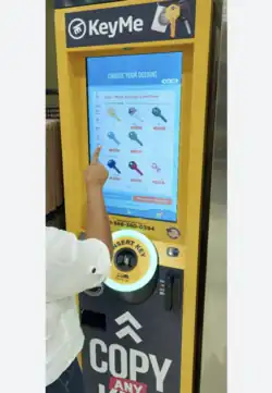 KeyMe's mobile app at one time, had users digitally scan their keys, the scans of which were then stored in the cloud. That data was then sent to physical kiosks, where new copies of those keys could be fabricated. Kiosks can also scan keys inserted directly into a scanning apparatus.[6] The machinery in the kiosks can quickly reproduce brass keys, key fobs, and car keys both with and without transponders. The kiosks are located in various cities across the United States, generally alongside a box retailer, grocery store, or corner store.[7][8] Originally kiosks would only allow access to keys via a finger print scan.[9] Keys can also be delivered by mail.[1]