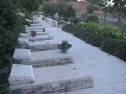 The section spans a rectangular area, with a grass plot extending from south to north in the center, surrounded by paved paths. The graves and headstones, designed uniformly, are set on three steps on either side of the lawn. At the southern end of the lawn stands a wall with the inscription "In blood and fire, Judah fell; in blood and fire, Judah will rise - Hashomer." Steps ascending from the corner of the section lead to the Roaring Lion statue.[4]