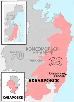 The Khabarovsk constituency (No.69[a]) is a Russian legislative constituency in Khabarovsk Krai. The constituency covers southern half of Khabarovsk and mostly rural southern and eastern Khabarovsk Krai up to Komsomolsk-on-Amur suburbs.