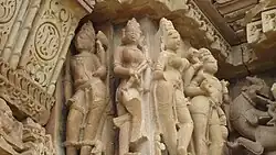 There is iconographic symbolism embedded in the arts displayed in Khajuraho temples.[4] Core Hindu values are expressed in multitude of ways. Even the Kama scenes, when seen in combination of sculptures that precede and follow, depict the spiritual themes such as moksha. In the words of Stella Kramrisch,