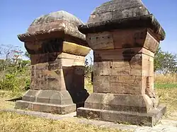 'Twin Stupas. The Twin Stupas are two red sandstone structures, 1.93 m. square and 4.20 m. high, with lotus-bud-shaped apices.