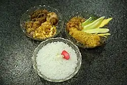 Khao chae (Thai: ข้าวแช่, pronounced [kʰâw t͡ɕʰɛ̂ː]) is "rice soaked in cool water". "Khao" means "rice" and "chae" means "to soak".[1] Around the time of King Rama II, the recipe was adapted from a Mon dish and then modified. It was meant to be made and consumed in the hot season, from mid-March to the end of April. Ice was not then available in Thailand, so the water was kept cool during hot season by putting it in an earthenware vessel in a shaded place. Some old recipes call for the use of camphor to cool the dish.