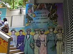 In 1993, in honour of the centenary of women's suffrage in New Zealand, a painted 2000–tile memorial and waterfall dedicated to Auckland's and New Zealand women's suffrage movement was installed in the stairway.[1] The artist Claudia Pond Eyley and ceramicist Jan Morrison chose the Auckland-based suffragists depicted in the memorial. The women featured in the lower and main section include (from left):