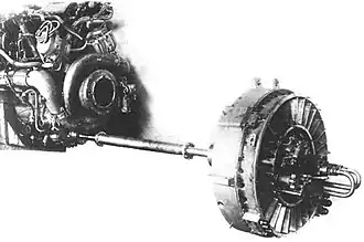 Both the Sukhoi Su-5 and Mikoyan-Gurevich I-250 used a single 1,230 kW (1,650 hp) Klimov VK-107 engine to drive a propeller and the VRDK’s single stage axial flow compressor. The VRDK was driven from a step-up gearbox and could be engaged/disengaged by the pilot via a clutch mechanism which connected it to the piston engine via a shaft. Air supplied by a duct running from the front of the aircraft was mixed with engine exhaust then compressed and fed to an afterburner before exiting via a nozzle at the back of the aircraft. Part of the compressor exhaust was also used to supercharge the engine.[2] To protect the pilot and airframe, the VRDK was cooled during operation by water from a 78 L (20.6 US gal) tank mounted in the fuselage.[1]