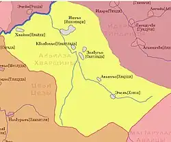 The Khwarshi people are a North Caucasian people living in Dagestan, in several small settlements. The Khwarshi are originally from the southeastern part of Tsumadinsky District, where seven Khwarshi settlements are located: Upper- and Lower Inkhokwari village (iqqo), Kwantlada village (kʼoλoqo), Santlada village (zoλuho), Khwarshi village (aλʼiqo), Khonokh (honoho) and Khwayni village (ečel).[3] They do not have an ethnonym for themselves as a united people, but instead they refer to themselves according to the settlement they are from. Thus they call themselves the Inkhokwari people (ixizo), the Kwantlada people (kʼoλozo), the Santlada people (zoλozo), the Khwarshi people (aλʼizo), the Khonokh people (honozo) and the Khwayni people (ečezo).