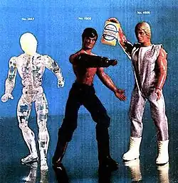 For some reason, instead of introducing other known Big Jim's villains or friends, CIPSA decided to create their own, but using parts of Big Jim toys. The LOBO Squad initial series introduced Garfio (The Hook), a weapons specialist armed with boomerangs and a bullwhip as associate of Doctor Drago, who has joined forces with Zorak, the Dual Menace. As a result of this new threat, Kid Acero recruits two popular superheroes named Invisible Man and Bionic Man. The LOBO Squadron plot presents all characters as skilled martial arts combatants, and for this reason, most of the figures of this sub line have minimal clothes, mostly black kung fu pants or sport pants. Some characters do not wear shoes at all.