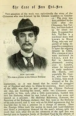 After the failed Yiwei Guangzhou uprising in 1895, Sun Yat-sen was wanted by the Qing government. British Hong Kong was pressured by the Qing to deport him.[1]