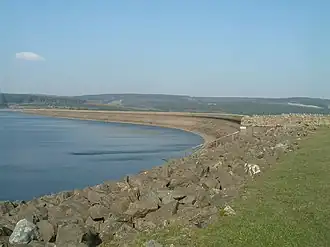 After the scheme was approved by Parliament in 1974, work to build the reservoir and the dam at the hamlet of Yarrow in the Kielder Valley began in 1975. The reservoir and dam were designed for Northumbrian Water by consulting civil engineers Babtie, Shaw and Morton.[6][7][8] Sir Frederick Gibberd and Partners were responsible for architectural aspects.[9] Earth moving and infrastructure construction was undertaken in a joint venture with AMEC and Balfour Beatty.[10]