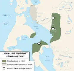 The traditional territory of the Kikiallus extended along the South Fork Skagit River to the confluence of the forks and the northern half of Camano Island, as well as some holdings on Whidbey Island near Strawberry Point.[4] The primary settlement of the Kikiallus was at kikiyalusali (meaning "Kikiallus place") at the mouth of Carpenter Creek near Conway, downriver from the present-day town. There were four longhouses there in the mid 19th century.[4][5] The Kikiallus also had villages at the confluence of the two forks of the Skagit River and at ʔəcəladiʔ (Utsalady Bay).[1][4][5][6]