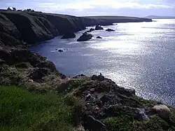 Sea cliffs run along much of the coast from the 892-foot (272 m) high Benwee Head and along the north coastline to Glinsk mountain. The rocky islands known as The Stags, pictured below are to be seen off the North Kilcommon coastline.[5]