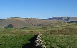 To the south, the area is dominated by Kilham Hill, 1,109 feet (338 m) high, and above Longknowe, in the valley of Kilham Burn, is the former township of Coldsmouth and Thompson's Walls, lying in the northern limits of the Cheviot Hills.[32] The geology of the upland area is composed of Devonian igneous rocks, and the landscape is characterised by smooth rolling hills and extensive plateaux of semi-natural acidic grass moor, known locally as white grass. There are areas of heather moorland and, in wetter parts, blanket bog dominated by dwarf shrubs, sedges, sphagnum moss and cotton grass. Coniferous woodland plantations are common on the upper valley slopes, with the remnants of broadleaved woodland, gorse scrub and meadow grassland in the steep sided valleys. The area reaches a height of 1,358 feet (414 m) at Coldsmouth Hill.[29]