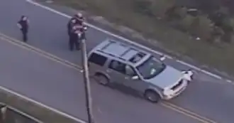 ![]() Terence Crutcher lying on the ground next to the driver's side of the vehicle, moments after he was shot. From aerial footage taken by Tulsa police department. | |