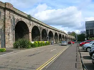 Kilmarnock railway viaduct, known locally as The Viaduct, is a railway viaduct crossing the town centre of Kilmarnock, and was constructed between 1843 and 1850. The bridge begins at Kilmarnock railway station and leads to destinations in England. It is a most distinctive feature of the town centre with 23 masonry arches and defines the northern boundary of the town centre. It was built in the 1840s to enable the Glasgow–Kilmarnock line to continue to Carlisle.[1]
