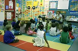 When children enter Kindergarten, they experience a shift from the family acting as a primary influence on the child's development, to an increased influence from their classroom environment. An important factor that contributes to how well a child adapts to the Kindergarten environment is his/her relationship with the teacher.[5] When children form a close relationship with their teacher, they appear better adjusted within the kindergarten context compared to when a conflicting relationship is developed. Children feel more comfortable approaching their teacher, as well as expressing their thoughts and feelings when a warm and open relationship is developed. This allows the child to effectively use the teacher as a means for support. This support can come in the form of social, emotional, or academic assistance which ultimately contributes to promoting the child's opportunities for success in the Kindergarten classroom.