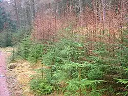 A number of fine trees and avenues survive from in the old estate policies, including several fine Wellintonias, oaks, limes lining the main drives, yews and specimen sycamores beside the River Ardle. Red squirrels are still common (2009) and the river has many hazels, birches and alders on its banks.