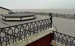 Through a door at the south-west corner of the main hall (now the vestibule) there was a York stone staircase to the roof and road, with 13 inches (33 cm) deep by 6 inches (15 cm) high by 4 feet (1.2 m) wide treads and a wrought iron handrail. The terraced roof, which as of 2013 still exists, was intended for promenade concerts with an audience of 700. It runs over to cover the verandah supported by iron columns and ornamental ironwork supplied by MacFarlane & Co of Glasgow in 1904 and still visible today. The bandstand (demolished 1969) had a "roof supported by slender iron pillars and fenced with elaborately designed ironwork." At the east and west of the building there were Victoria stone drinking fountains (the eastern one was still visible as of 2011). The walls, wood and ironwork were painted with Velure.[12][31]