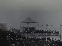 The Pavilion was opened at 3pm on Easter Monday, 4 April 1904.[12] Thousands of spectators stood outside, and 300 invited persons squeezed into the little hall (now the vestibule). People pressed their faces against the windows or stood in a "dense mass" on East Cliff, and the door was guarded by Mr Boorman the Town Beadle in "sober uniform". The Pavilion was decorated with streamers, and flags including the Union Jack, the French Tricolour and the US Stars and Stripes. The Band of the Corps of the Royal Engineers was conducted by Lieutenant Summer in the bandstand on the roof. Inside the hall, flags were arranged around the walls and over Dence's memorial tablet awaiting the unveiling ceremony.[12] The platform and its table were piled and surrounded with flowers. The band stopped, the audience stood, and the council dignitaries processed onto the platform, headed by chairman of the council G. Farley JP, CC, with Mrs Dence on his arm, and guest of honour Thomas Dence who drew special applause. Proceedings were begun by a child, thus: