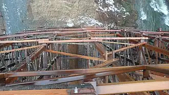 The bridge's dimensions measure 44 m (144 ft) high and 188 m (617 ft) long, making it the largest wooden trestle in the Commonwealth of Nations and one of the highest railway trestles in the world.[2] It was constructed out of old-growth Douglas fir timbers,[3] and has an unusual seven-degree curve.[4]