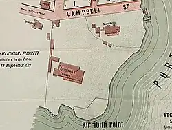 In 1865, Thomas Lawry died at the age of 44.[16] The death notice records that the name of the house was still Sophienberg.[16] Two years later in 1867, Esther married James Taylor,[17] who was the Commissary-General of Ordnance. This couple then lived in the house with Esther’s two children, one of whom was Thomas Terry Trewyn Lawry. In 1891, James Taylor died.[18] By this time the house had been named "Kirribilli" and was located in Campbell Street as the map on the left shows. In 1900, Esther died,[19] and the house was left to her son Thomas Terry Trewyn Lawry.