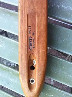 Shuttles were constructed from a dense heavy hardwood with metal tips. The wood was traditionally sourced from a box tree. Imported timbers such as persimmon and cornel were also commonly used. The shuttle was shaped and hollowed using conventional wood working techniques, and the metal tips are pressed onto the block. Strips of fox fur or similar were stuck to the inside of a shuttle to stop the thread ballooning as it left the pirn. There are many designs of shuttle. The Pemberton Loom needed a shuttle with a hinged shuttle-peg to hold the pirn; the later Draper loom shuttles clasped metal rings on the head of the pirn using a spring steel clip. The Draper Company claimed it had developed over 5000 different types of shuttle to meet "the needs of the mills and the whims of the weavers".[5][6]