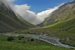 The hydronym Kistinka derives from one of the old Ingush ethnonyms — Kisti [2][3] and is used to refer to both rivers Arm-khi (Ingush: Ӏарам-хий, romanized: Aram-khi; Georgian: ქისტეთისწყალი, Kistetis-tskali)[4] in the Dzheyrakhsky District and Oakhkara-khi (Georgian: ხდე, ქისტურა, romanized: khde, kist'ura) in the Kazbegi Municipality.[5] In 1910, Foma Gorepekin composes a short guide titled: «In the mountains of the Terek region», where he mentions being escorted along the gorge of the river Kistinka by the Buzurtanov brothers — well-known local guides and alpinists from the neighbouring Ingush village Gveleti.[6]