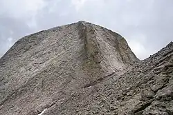 Kit Carson Peak, Officially known as the Kit Carson Mountain, is a high mountain summit of the Crestones in the Sangre de Cristo Range of the Rocky Mountains of North America. The 14,165.2-foot (4,318 m) fourteener is located 5.2 miles (8.4 km) ESE (bearing 102°) of the Town of Crestone in Saguache County, Colorado, United States.[2][3] The name Kit Carson Mountain is used for both the massif with three summits (Columbia Point, Kit Carson Peak and Challenger Point), or to describe the main summit only. The mountain is named in honor of American frontiersman Christopher Houston "Kit" Carson. The Crestones are a cluster of high summits in the Sangre de Cristo Range, comprising Crestone Peak, Crestone Needle, Kit Carson Peak, Challenger Point, Humboldt Peak, and Columbia Point. They are usually accessed from common trailheads.