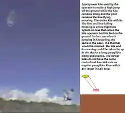 When flying a world-record-sized recreation kite, a famous professional kite flier lost his life as he became an accidental mooring of the large kite. When extreme-sport kitesurfers are themselves the dynamic mooring gone astray, they sometimes slam into rocks, buildings, people, thorns, trees and end up with minor to fatal injuries. The kite system called paraglider has the human pilot as the dynamic mooring; when collapse of the kite's wing occurs too near the ground and there is not time to use a parachute, damage occurs to people and property. When a statically moored kite-type hang glider is moored improperly, gusts sometimes lift the kite and the kite hang glider gets into a lockout condition and slams into the ground, breaking itself and sometimes causing injury to persons and other property. Mooring kites so the kite can reach high voltage electric power lines can cause outages in electrical service and sometimes injury or death to people. Most every recreational kite sold has a tag that refers to where to fly the kite; this is implicitly telling the operator to keep the kite moored in a safe manner. Humans are responsible for the kites they anchor or set into free-flight. One of the downsides to the war-time use of barrage balloon (kytoons) involved cut tether[2] cables that dragged into power lines causing loss of production of other needed goods. See the safety list at National Kite Month.[3]
