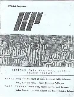 They spent the first four post-war years in the Sheffield Association League, before joining the Yorkshire League in 1949.[9] After suffering two disastrous campaigns at this higher level, they moved back to the Worksop & District League, where they were renamed as Kiveton Park United.[10] They stayed in Worksop football until 1959, when they moved to the East Derbyshire League, and before long they were finding great success - in the 1961–62 season they won seven trophies.[11] In 1963 the club successfully applied to re-join the Yorkshire League, and was accepted by the name of Kiveton Park.