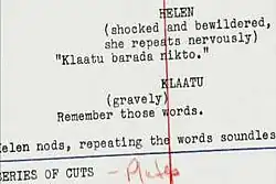 ![]() Script page of The Day the Earth Stood Still (1951) showing the phrase | |